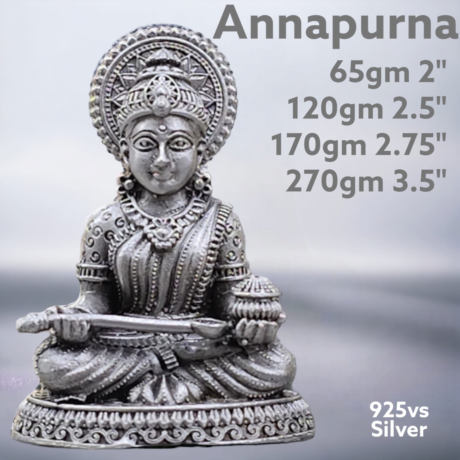 Keeping a **silver idol of Goddess Annapurna** at home is believed to bring abundance, nourishment, and never-ending prosperity to the household. Goddess Annapurna is the divine mother of food, nourishment, and well-being. Her presence in the home symbolizes that the kitchen and dining area will never lack food, and the family will always be blessed with good health and prosperity. Silver, being a sattvic and pure metal, enhances the sacredness of the idol and amplifies divine energy. The Annapurna silver idol is especially beneficial for homes where peace, harmony, and abundance are desired. Placing the idol in the kitchen or pooja room is considered highly auspicious and ensures that the household is free from hunger, malnutrition, and negativity. Regular worship of the idol fosters a sense of gratitude, contentment, and spiritual well-being, while also strengthening family bonds and domestic happiness. It is also said to attract **Lakshmi’s grace** and overall prosperity when worshipped with devotion.
